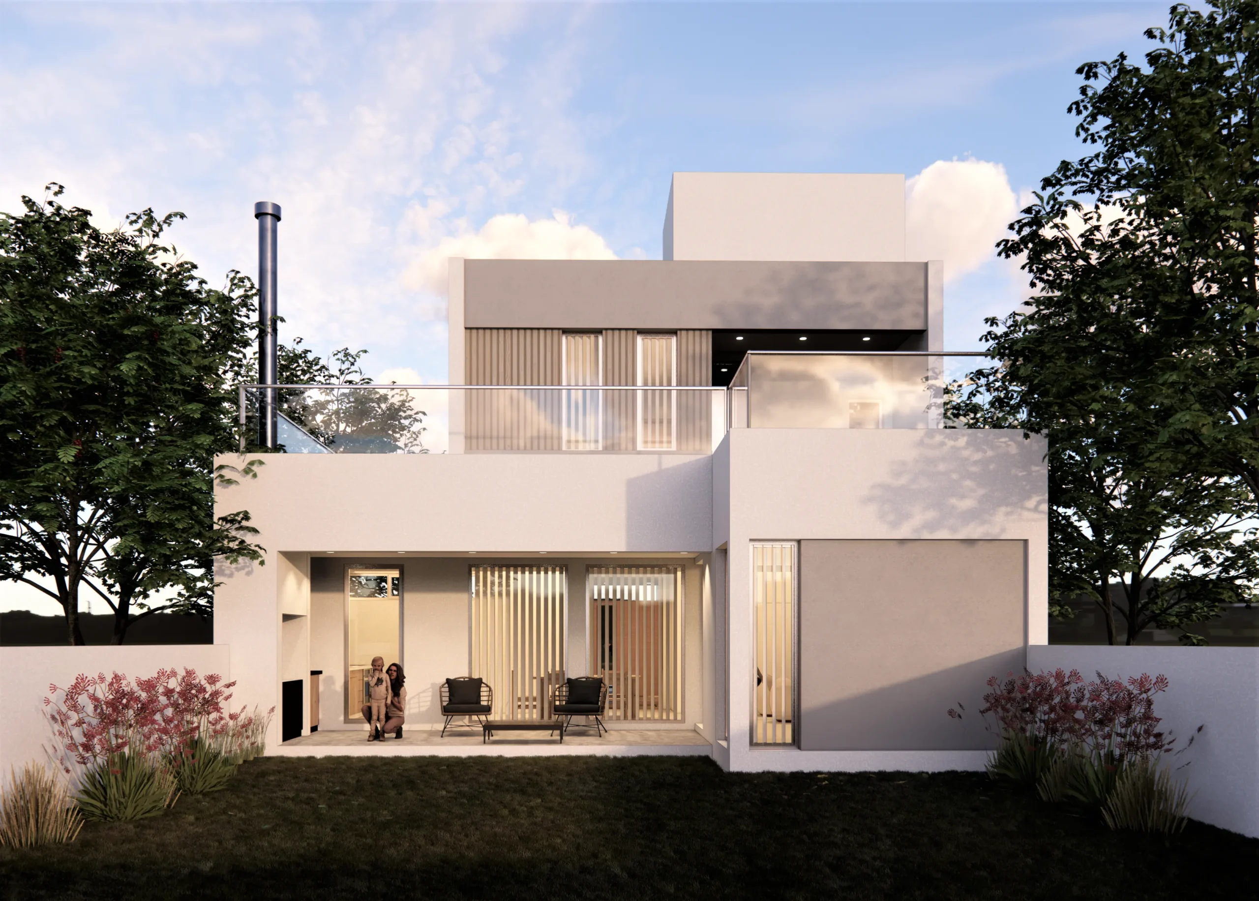 Este proyecto se basó en un prototipo PRO.CRE.AR de una planta de 60m2, en primera instancia sin alterar el mismo, desarrollando luego una planta alta cumpliendo con la necesidad del cliente, orientada a un estilo moderno, utilizando materiales y colores claros para darle luminosidad a la fachada.